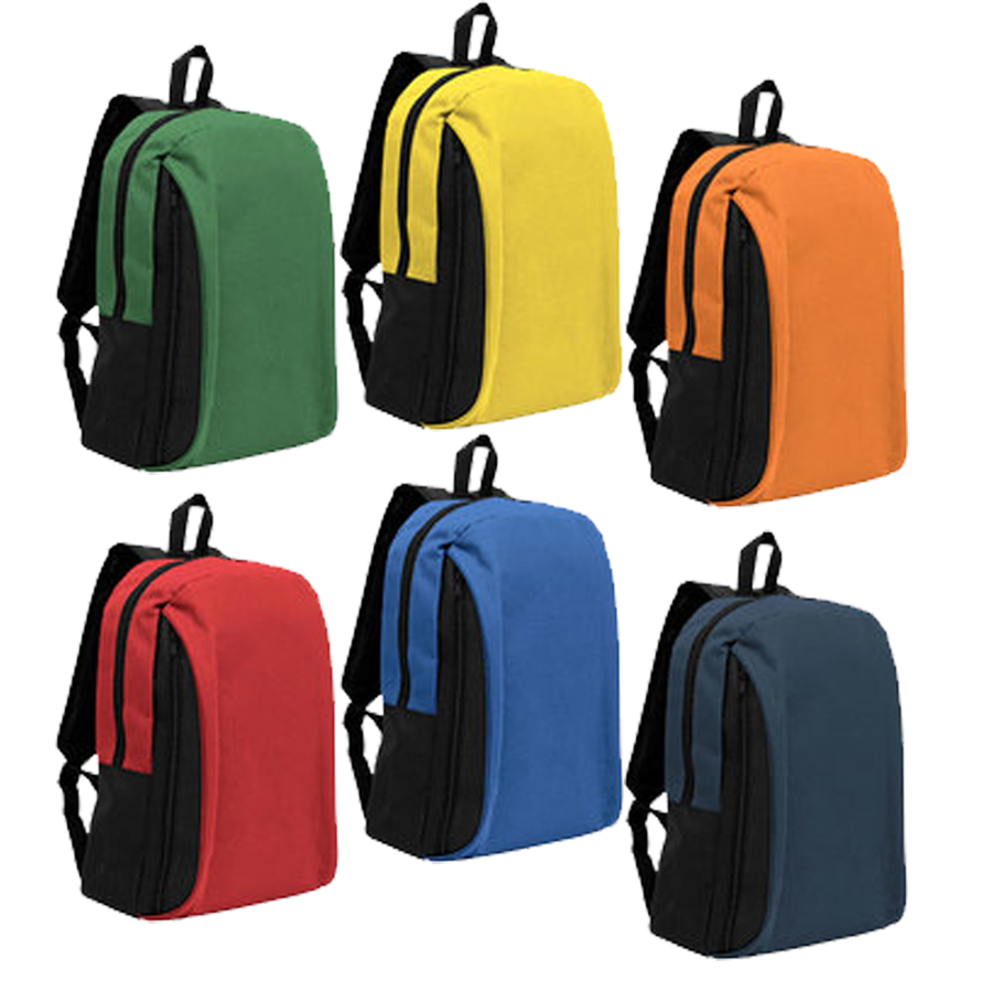 Mochila urbana. 43 x 31 x 17 cm. 20 litros. Bitono (cuerpo principal de un color y laterales, espalda, correas, asa y cierres en color negro). Compartimento principal con cierre. Amplio compartimento frontal con cierre lateral vertical. Interior forrado y reforzado. Correas ajustables y espalda acolchada. Tiradores de cierres metálicos.