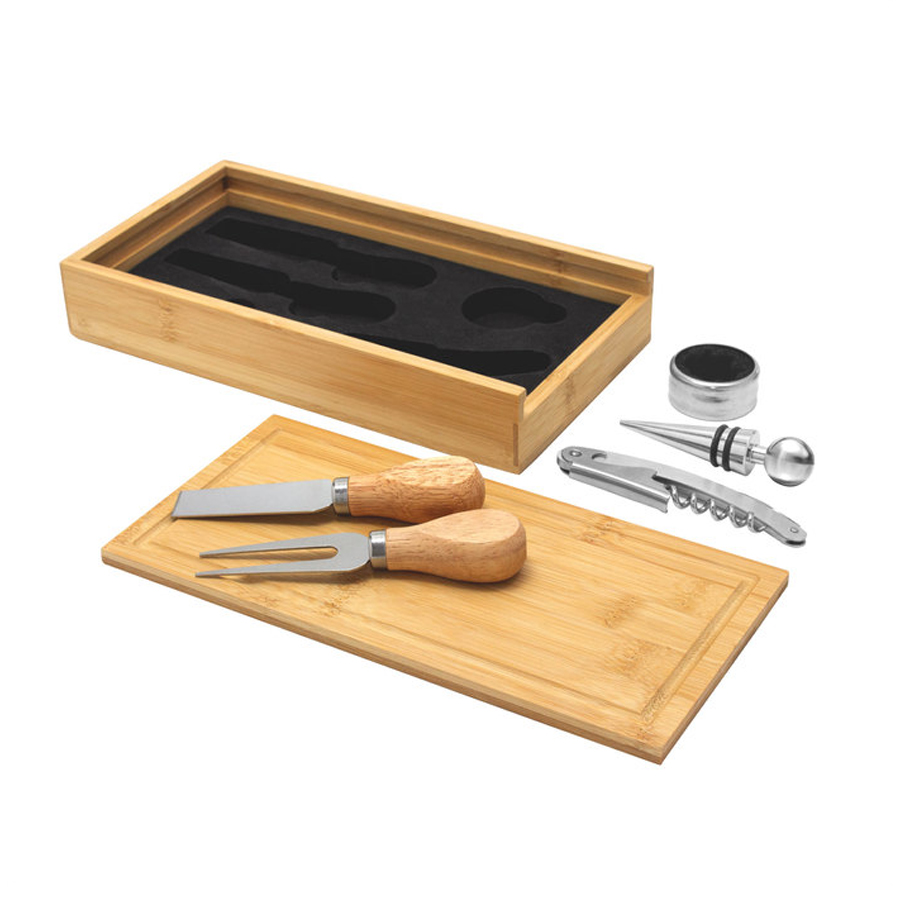 Set de accesorios para vino y corte de quesos. 24.5 x 13 x 3.3 cm. (caja). Caja con tapa deslizable de bambú. Tapa / tabla de corte de 24 x 12 x 0,8 cm. Contiene 5 piezas: Destapador sacacorchos (acero inoxidable 420, 11 cm. y 50 g.); Cuchillo y tenedor de queso (acero inoxidable 420 con mango de madera de caucho, 12,8 cm. y 25 g. c/u) Anillo de vino (acero inoxidable 420 y non woven, Ø 3,9 cm.) ; y Tapón de vino (aleación de zinc, 56 g.).
